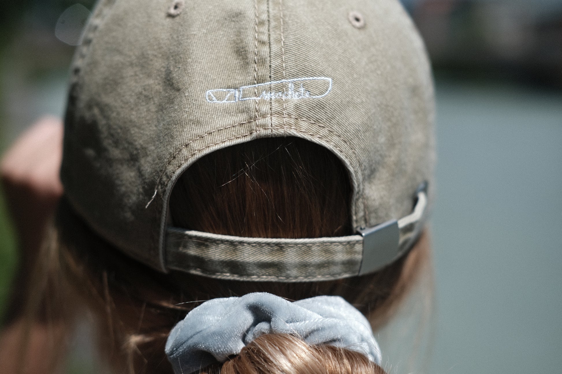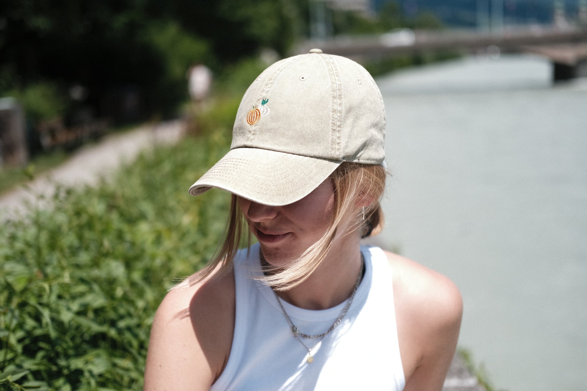 Khakifarbene Dad Cap mit Fenchel-Kürbis Stickerei vorne und Machete Logo auf der Rückseite.